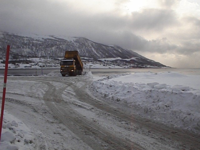 街中で集めた雪を海へ捨てている