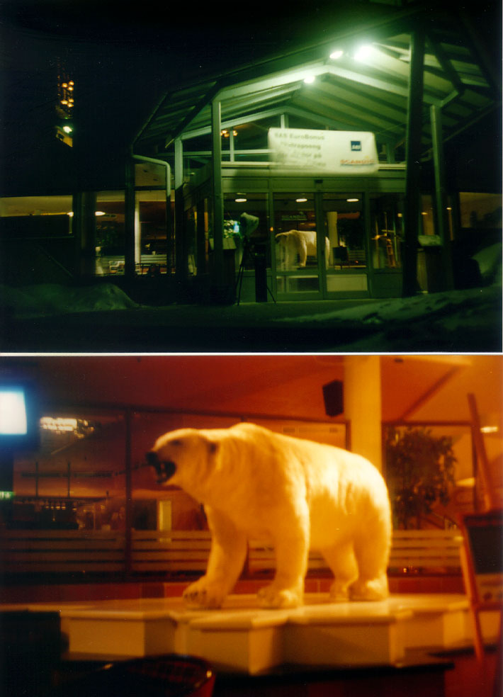 宿泊したホテルの入口と、飾られていたシロクマの剥製。