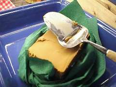 オスロを経由してトロムソへ到着。 翌朝の食事の1つ。ヤギ乳から作られたチーズ。 Geitost(ヤイトオスト)と言います。クセが強いのでいっぱい食べてはいけません。 HOVEL(ホーベル、本当はOに斜線が入る)と言う チーズスライスカッターで 薄く削り、クラッカーにのせて食べるとグット。 クラッカーは色々な種類がありました。